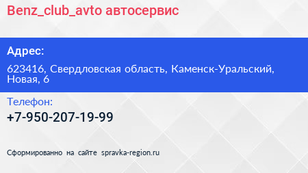 Benz_club_avto, автосервис по адресу 623416, Свердловская область, Каменск-Уральский, Новая, 6 в дальнейшем Организация, размещена в следующих категориях: