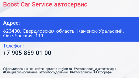 Boost Car Service, автосервис по адресу 623430, Свердловская область, Каменск-Уральский, Октябрьская, 111 в дальнейшем Организация, размещена в следующих категориях: