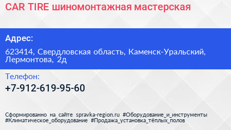 #CAR TIRE, шиномонтажная мастерская по адресу 623414, Свердловская область, Каменск-Уральский, Лермонтова, 2д в дальнейшем Организация, размещена в следующих категориях: