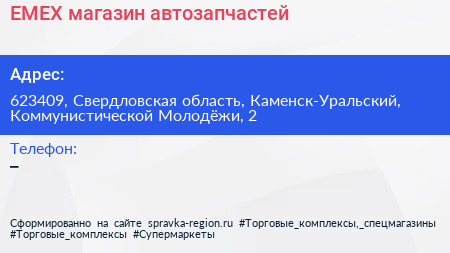 EMEX, магазин автозапчастей по адресу 623409, Свердловская область, Каменск-Уральский, Коммунистической Молодёжи, 2 в дальнейшем Организация, размещена в следующих категориях: