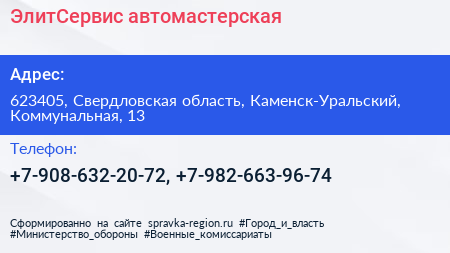 ЭлитСервис, автомастерская по адресу 623405, Свердловская область, Каменск-Уральский, Коммунальная, 13 в дальнейшем Организация, размещена в следующих категориях: