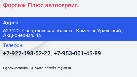 Форсаж Плюс, автосервис по адресу 623420, Свердловская область, Каменск-Уральский, Акционерная, 4а в дальнейшем Организация, размещена в следующих категориях: