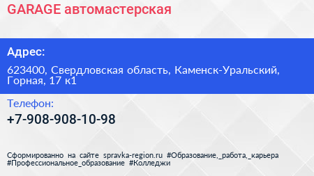 GARAGE, автомастерская по адресу 623400, Свердловская область, Каменск-Уральский, Горная, 17 к1 в дальнейшем Организация, размещена в следующих категориях: