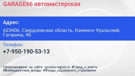 GARAGE66, автомастерская по адресу 623406, Свердловская область, Каменск-Уральский, Гагарина, 4Б в дальнейшем Организация, размещена в следующих категориях: