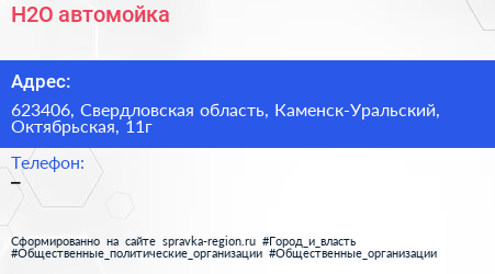 H2O, автомойка по адресу 623406, Свердловская область, Каменск-Уральский, Октябрьская, 11г в дальнейшем Организация, размещена в следующих категориях:
