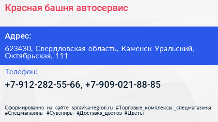Красная башня, автосервис по адресу 623430, Свердловская область, Каменск-Уральский, Октябрьская, 111 в дальнейшем Организация, размещена в следующих категориях: