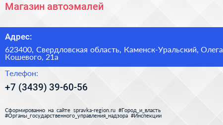 Магазин автоэмалей по адресу 623400, Свердловская область, Каменск-Уральский, Олега Кошевого, 21а в дальнейшем Организация, размещена в следующих категориях: