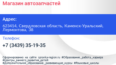 Магазин автозапчастей по адресу 623414, Свердловская область, Каменск-Уральский, Лермонтова, 38 в дальнейшем Организация, размещена в следующих категориях: