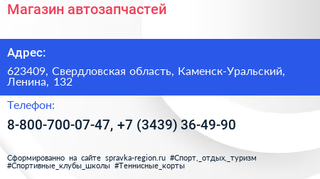 Магазин автозапчастей по адресу 623409, Свердловская область, Каменск-Уральский, Ленина, 132 в дальнейшем Организация, размещена в следующих категориях: