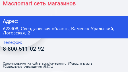 Маслоmart, сеть магазинов по адресу 623408, Свердловская область, Каменск-Уральский, Логовская, 2 в дальнейшем Организация, размещена в следующих категориях: