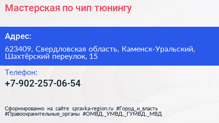 Мастерская по чип-тюнингу по адресу 623409, Свердловская область, Каменск-Уральский, Шахтёрский переулок, 15 в дальнейшем Организация, размещена в следующих категориях: