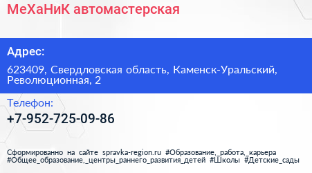 МеХаНиК, автомастерская по адресу 623409, Свердловская область, Каменск-Уральский, Революционная, 2 в дальнейшем Организация, размещена в следующих категориях: