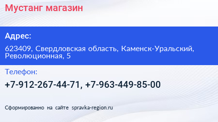 Мустанг, магазин по адресу 623409, Свердловская область, Каменск-Уральский, Революционная, 5 в дальнейшем Организация, размещена в следующих категориях:
