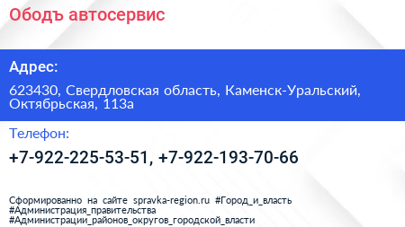 Ободъ, автосервис по адресу 623430, Свердловская область, Каменск-Уральский, Октябрьская, 113а в дальнейшем Организация, размещена в следующих категориях: