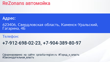 ReZonans, автомойка по адресу 623406, Свердловская область, Каменск-Уральский, Гагарина, 4Б в дальнейшем Организация, размещена в следующих категориях: