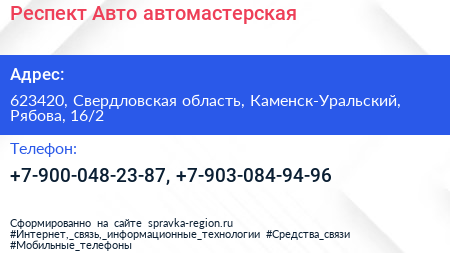 Респект Авто, автомастерская по адресу 623420, Свердловская область, Каменск-Уральский, Рябова, 16/2 в дальнейшем Организация, размещена в следующих категориях: