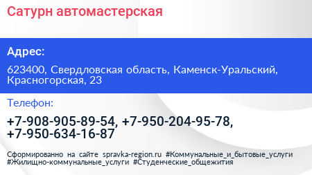 Сатурн, автомастерская по адресу 623400, Свердловская область, Каменск-Уральский, Красногорская, 23 в дальнейшем Организация, размещена в следующих категориях: