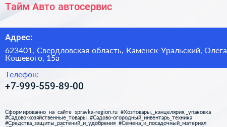 Тайм Авто, автосервис по адресу 623401, Свердловская область, Каменск-Уральский, Олега Кошевого, 15а в дальнейшем Организация, размещена в следующих категориях:
