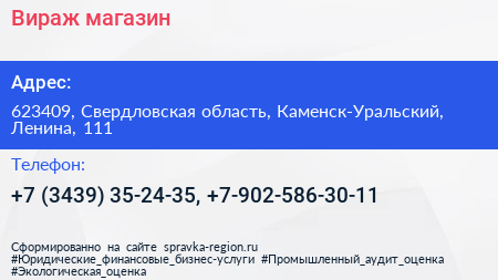 Вираж, магазин по адресу 623409, Свердловская область, Каменск-Уральский, Ленина, 111 в дальнейшем Организация, размещена в следующих категориях: