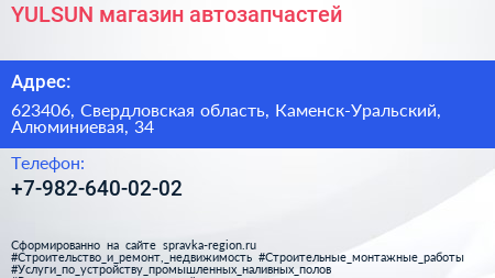 YULSUN, магазин автозапчастей по адресу 623406, Свердловская область, Каменск-Уральский, Алюминиевая, 34 в дальнейшем Организация, размещена в следующих категориях: