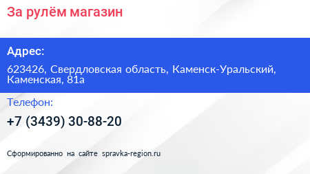 За рулём, магазин по адресу 623426, Свердловская область, Каменск-Уральский, Каменская, 81а в дальнейшем Организация, размещена в следующих категориях: