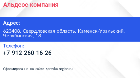 Альдеос, компания по адресу 623408, Свердловская область, Каменск-Уральский, Челябинская, 18 в дальнейшем Организация, размещена в следующих категориях: