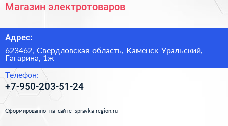 Магазин электротоваров по адресу 623462, Свердловская область, Каменск-Уральский, Гагарина, 1ж в дальнейшем Организация, размещена в следующих категориях: