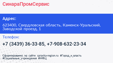 СинараПромСервис по адресу 623400, Свердловская область, Каменск-Уральский, Заводской проезд, 1 в дальнейшем Организация, размещена в следующих категориях: