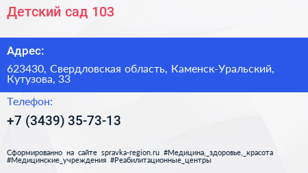 Детский сад №103 по адресу 623430, Свердловская область, Каменск-Уральский, Кутузова, 33 в дальнейшем Организация, размещена в следующих категориях: