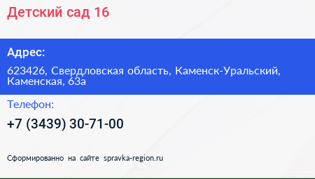 Детский сад №16 по адресу 623426, Свердловская область, Каменск-Уральский, Каменская, 63а в дальнейшем Организация, размещена в следующих категориях: