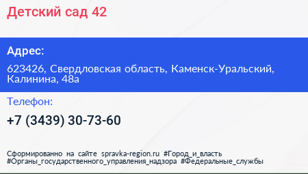 Детский сад №42 по адресу 623426, Свердловская область, Каменск-Уральский, Калинина, 48а в дальнейшем Организация, размещена в следующих категориях: