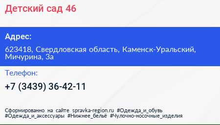Детский сад №46 по адресу 623418, Свердловская область, Каменск-Уральский, Мичурина, 3а в дальнейшем Организация, размещена в следующих категориях: