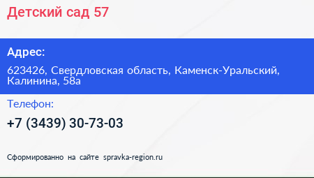 Детский сад №57 по адресу 623426, Свердловская область, Каменск-Уральский, Калинина, 58а в дальнейшем Организация, размещена в следующих категориях:
