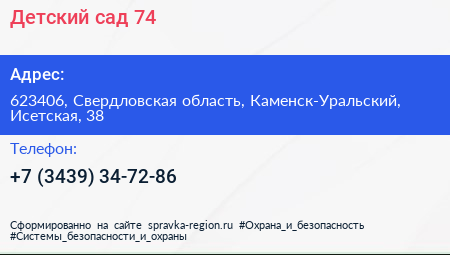 Детский сад №74 по адресу 623406, Свердловская область, Каменск-Уральский, Исетская, 38 в дальнейшем Организация, размещена в следующих категориях: