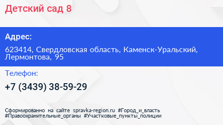 Детский сад №8 по адресу 623414, Свердловская область, Каменск-Уральский, Лермонтова, 95 в дальнейшем Организация, размещена в следующих категориях: