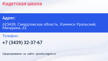 Кадетская школа по адресу 623428, Свердловская область, Каменск-Уральский, Мичурина, 61 в дальнейшем Организация, размещена в следующих категориях: