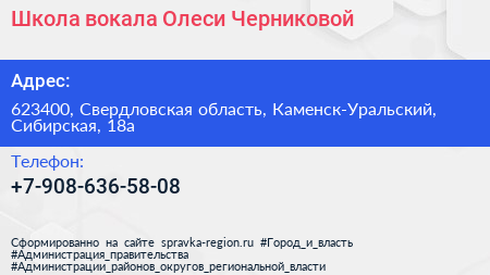 Школа вокала Олеси Черниковой по адресу 623400, Свердловская область, Каменск-Уральский, Сибирская, 18а в дальнейшем Организация, размещена в следующих категориях: