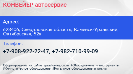 КОНВЕЙЕР, автосервис по адресу 623406, Свердловская область, Каменск-Уральский, Октябрьская, 52а в дальнейшем Организация, размещена в следующих категориях: