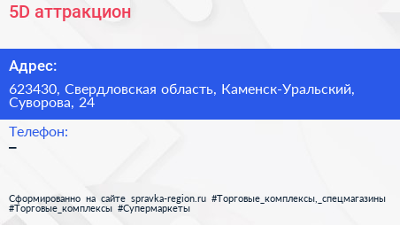 5D-аттракцион по адресу 623430, Свердловская область, Каменск-Уральский, Суворова, 24 в дальнейшем Организация, размещена в следующих категориях: