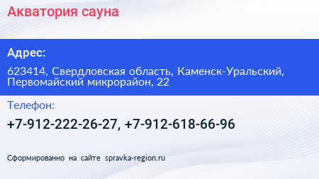 Акватория, сауна по адресу 623414, Свердловская область, Каменск-Уральский, Первомайский микрорайон, 22 в дальнейшем Организация, размещена в следующих категориях:
