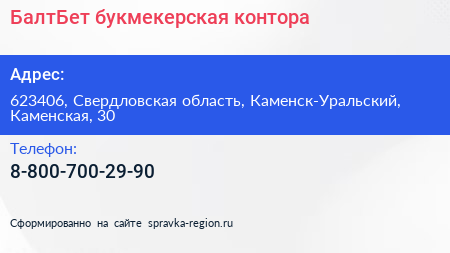 БалтБет, букмекерская контора по адресу 623406, Свердловская область, Каменск-Уральский, Каменская, 30 в дальнейшем Организация, размещена в следующих категориях: