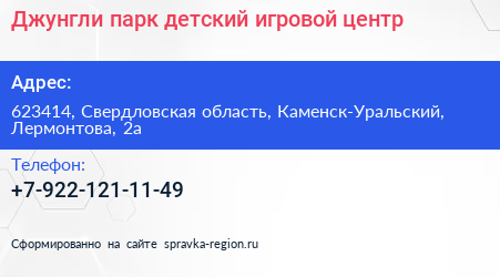 Джунгли парк, детский игровой центр по адресу 623414, Свердловская область, Каменск-Уральский, Лермонтова, 2а в дальнейшем Организация, размещена в следующих категориях: