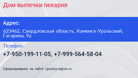 Дом выпечки, пекарня по адресу 623462, Свердловская область, Каменск-Уральский, Гагарина, 9а в дальнейшем Организация, размещена в следующих категориях: