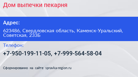 Дом выпечки, пекарня по адресу 623486, Свердловская область, Каменск-Уральский, Советская, 233Б в дальнейшем Организация, размещена в следующих категориях: