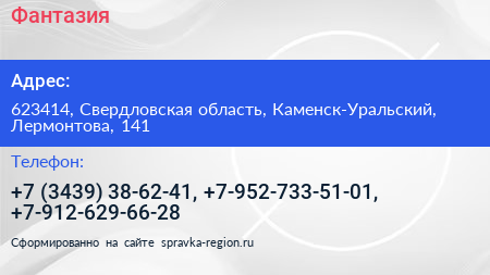 Фантазия по адресу 623414, Свердловская область, Каменск-Уральский, Лермонтова, 141 в дальнейшем Организация, размещена в следующих категориях:
