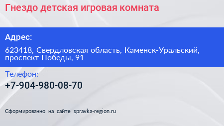 Гнездо, детская игровая комната по адресу 623418, Свердловская область, Каменск-Уральский, проспект Победы, 91 в дальнейшем Организация, размещена в следующих категориях: