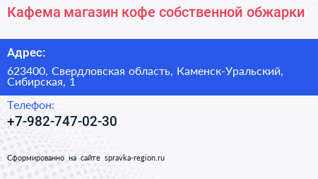 Кафема, магазин кофе собственной обжарки по адресу 623400, Свердловская область, Каменск-Уральский, Сибирская, 1 в дальнейшем Организация, размещена в следующих категориях: