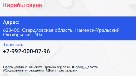 Карибы, сауна по адресу 623406, Свердловская область, Каменск-Уральский, Октябрьская, 40а в дальнейшем Организация, размещена в следующих категориях: