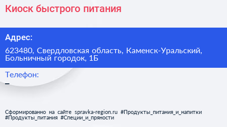 Киоск быстрого питания по адресу 623480, Свердловская область, Каменск-Уральский, Больничный городок, 1Б в дальнейшем Организация, размещена в следующих категориях: