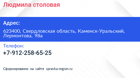 Людмила, столовая по адресу 623400, Свердловская область, Каменск-Уральский, Лермонтова, 98а в дальнейшем Организация, размещена в следующих категориях: